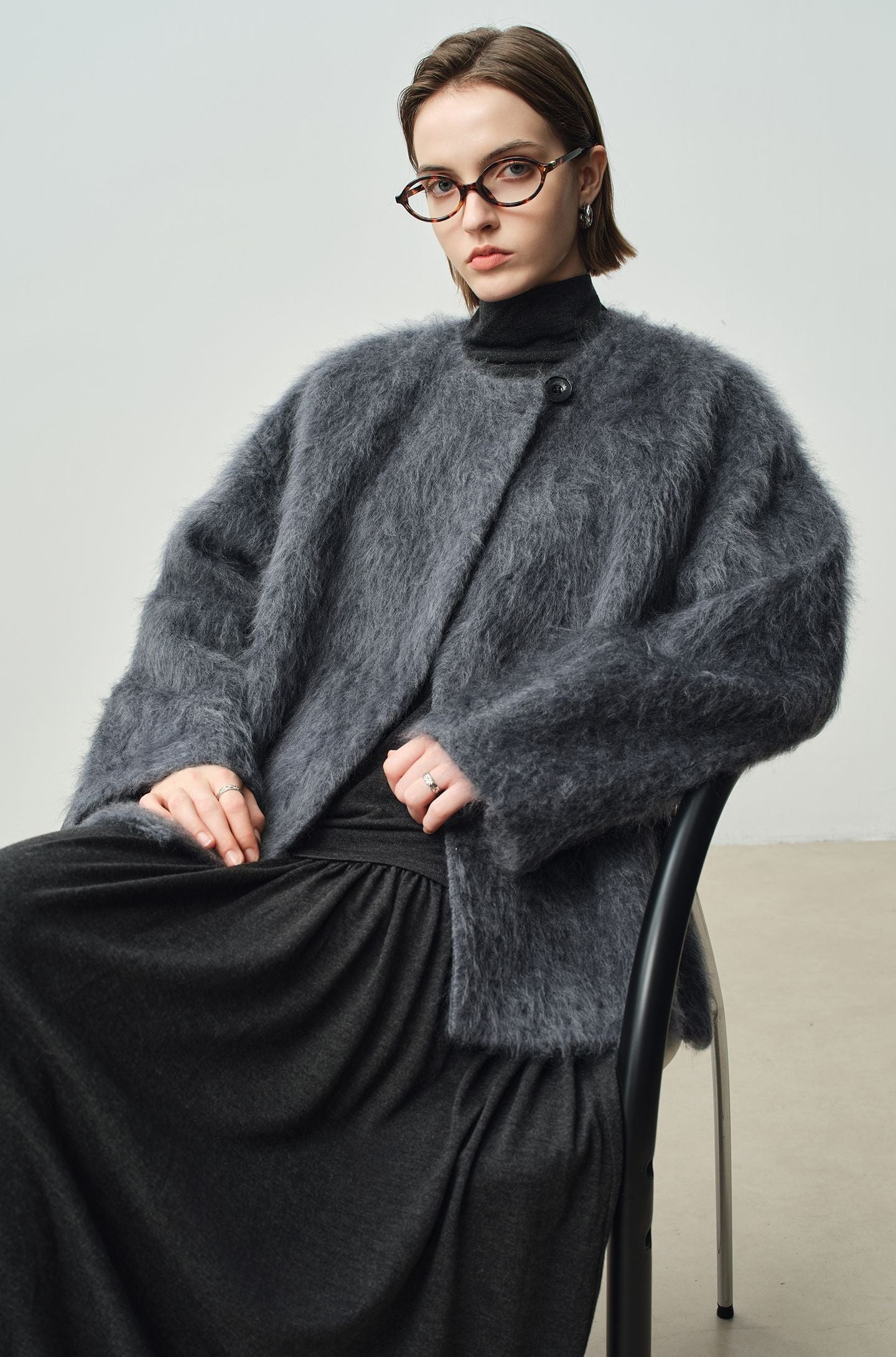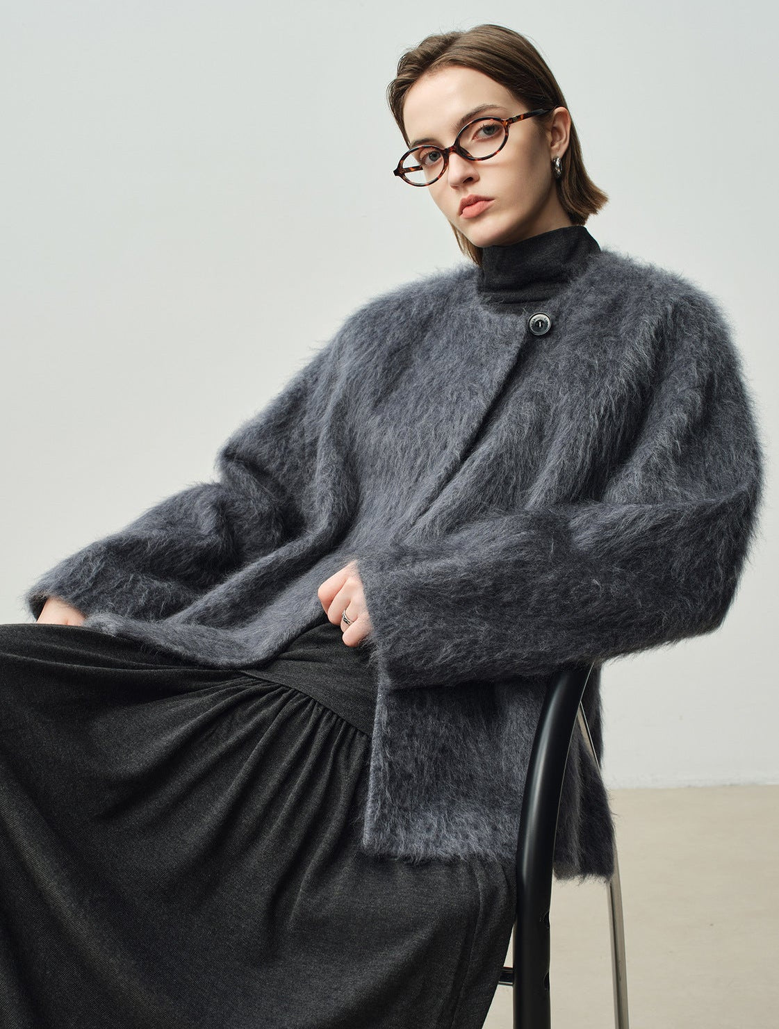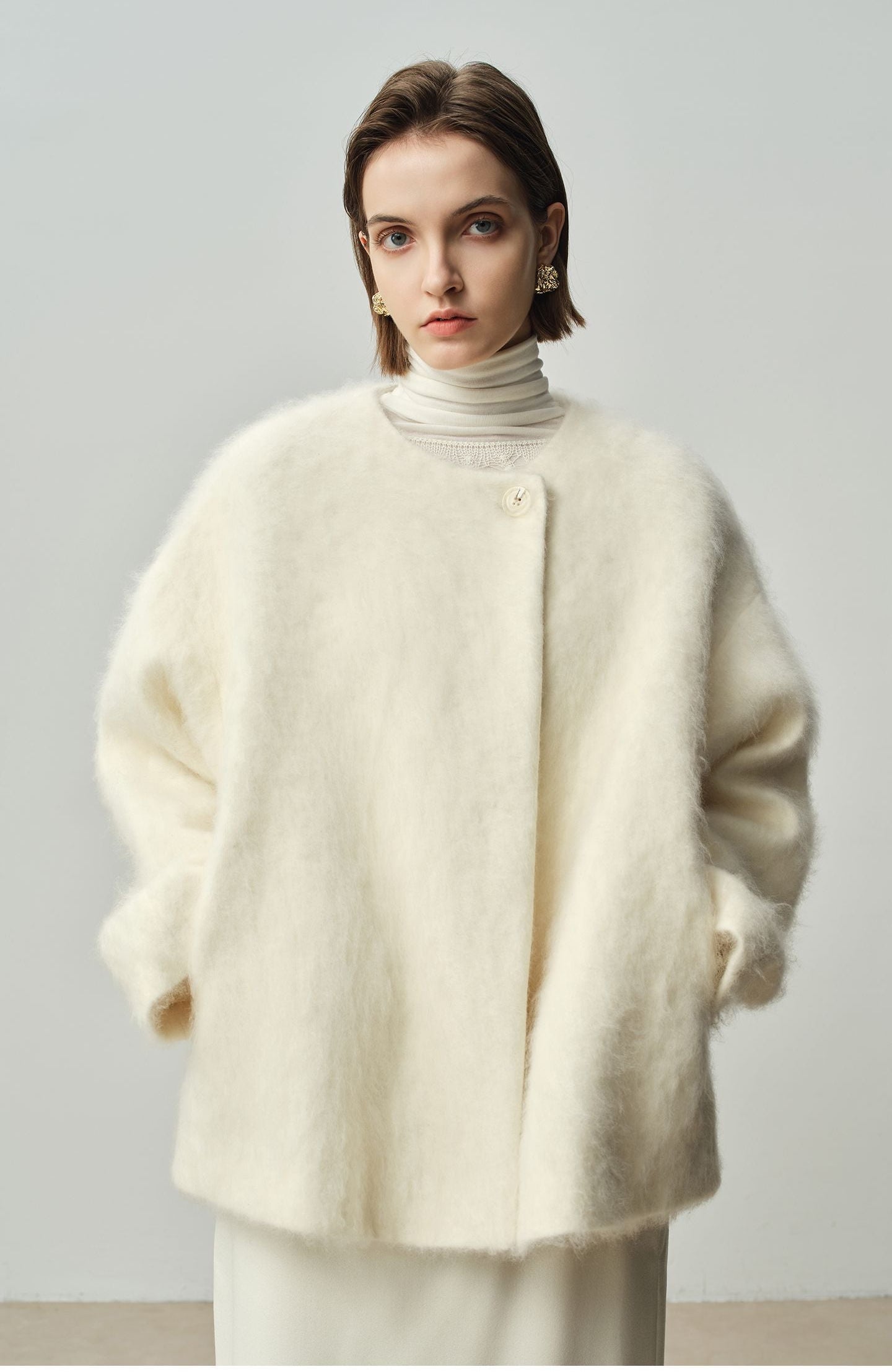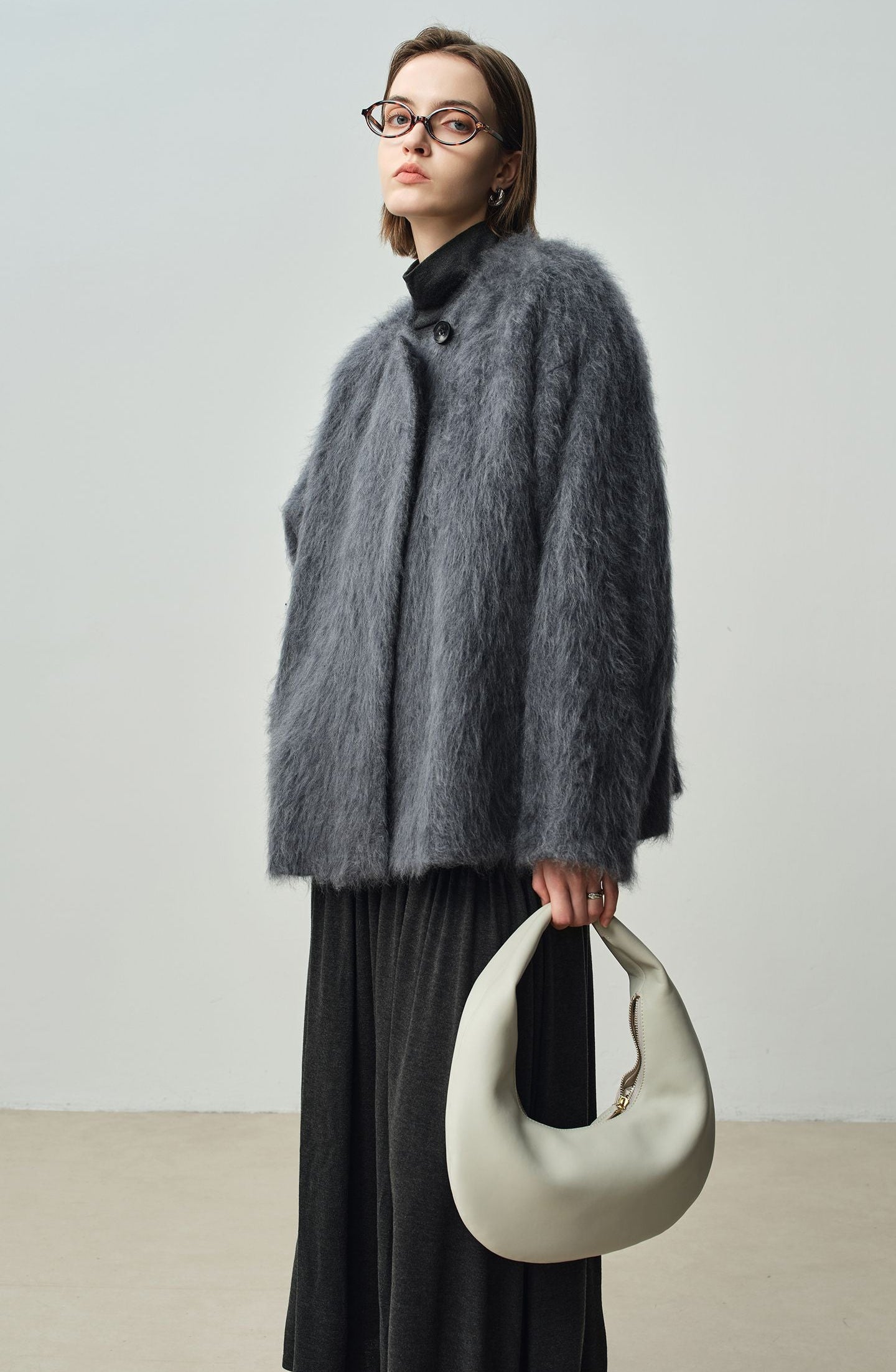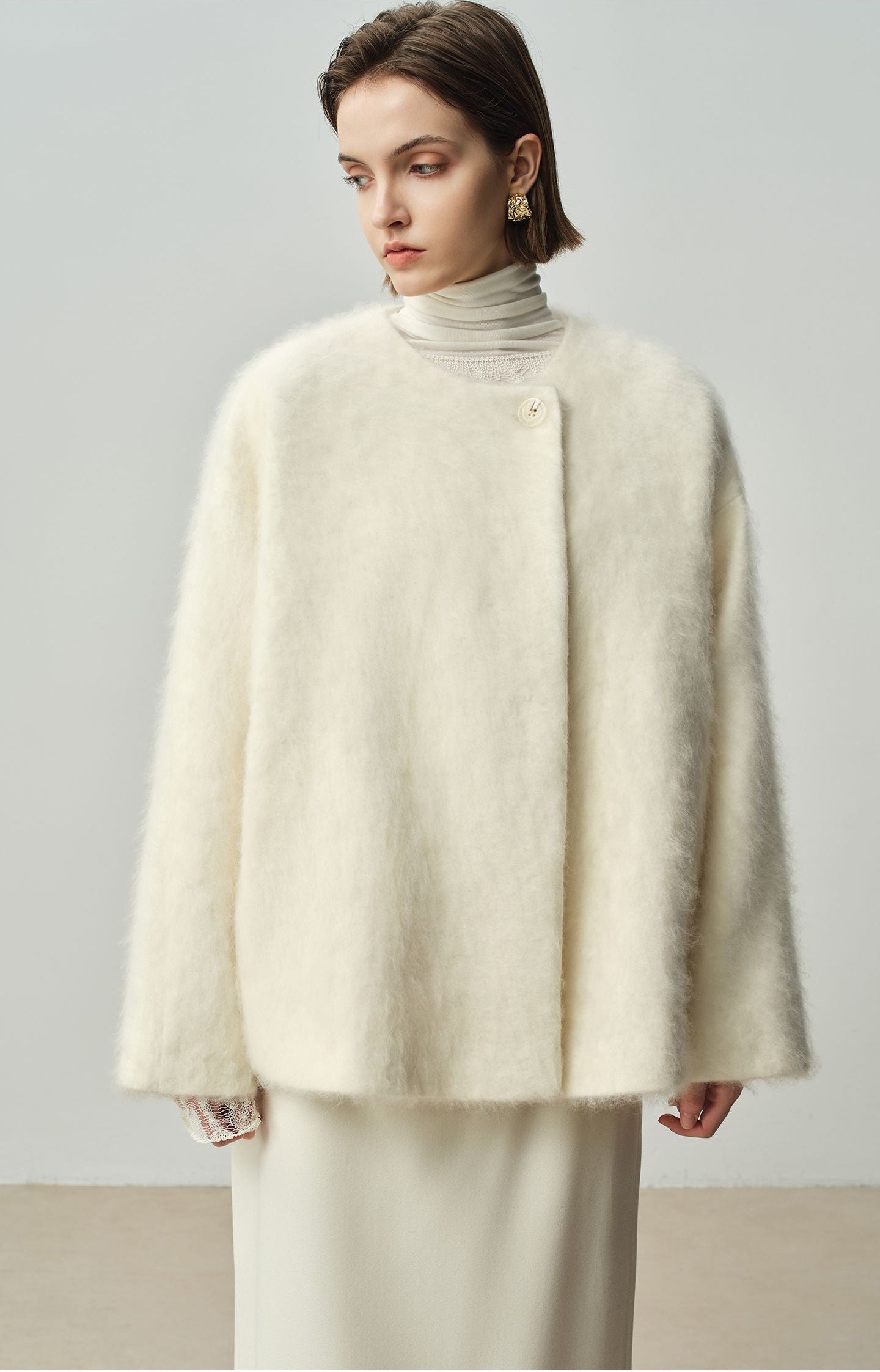 Yuvarlak yaka detayı, uzun tüy dokusu ve tek düğmeli tasarımıyla sade ama etkileyici bir görünüm kazandırır.