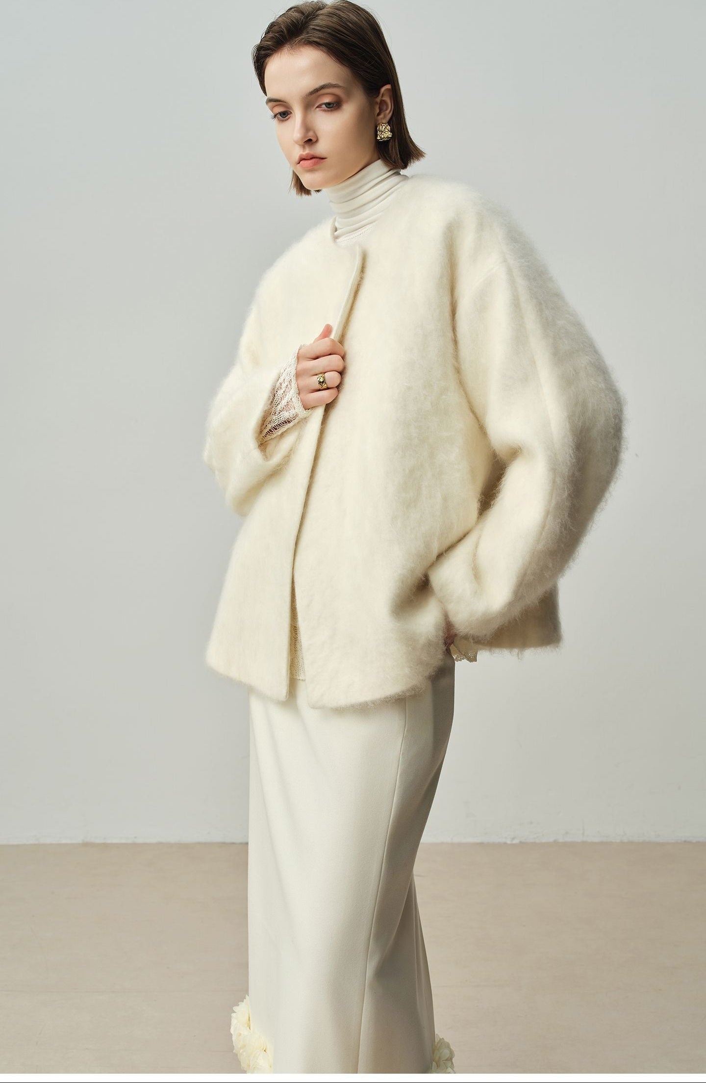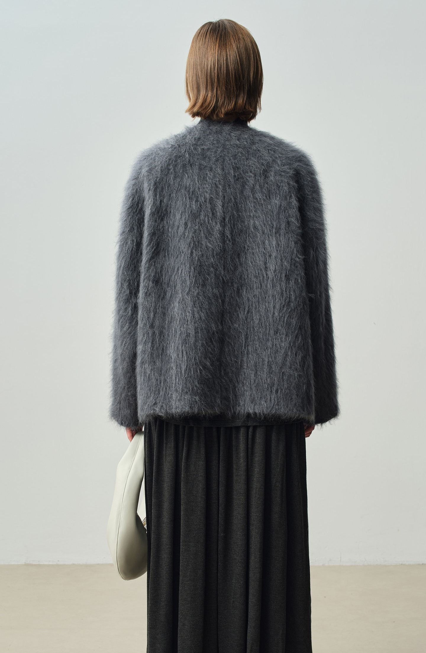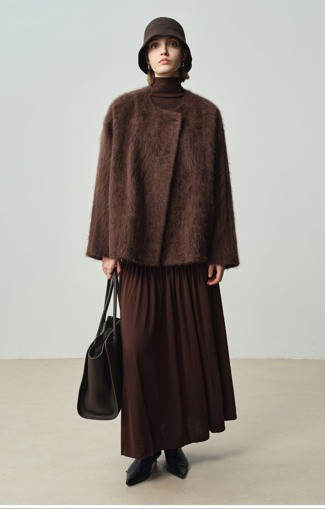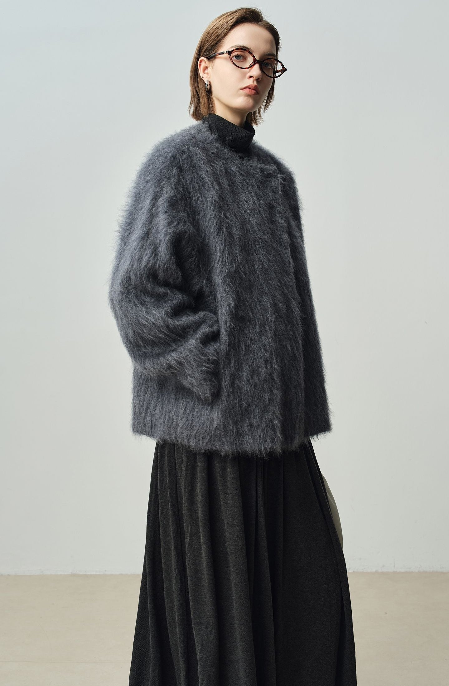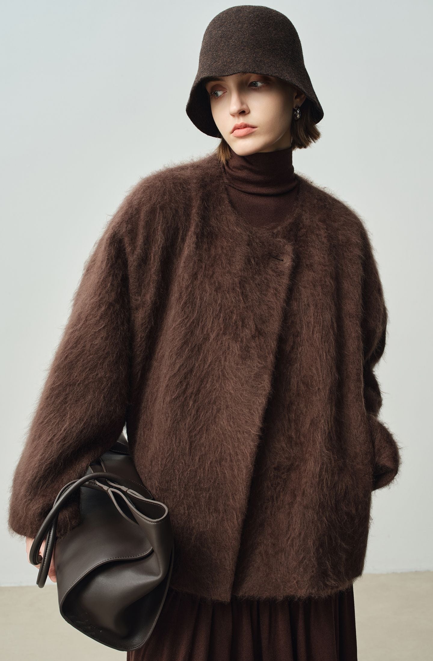 Yuvarlak yaka detayı, uzun tüy dokusu ve tek düğmeli tasarımıyla sade ama etkileyici bir görünüm kazandırır.