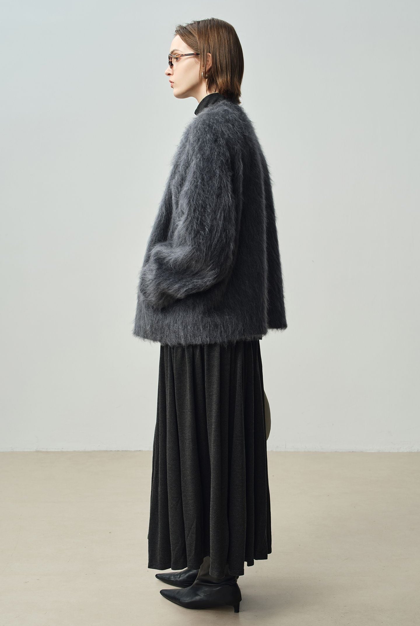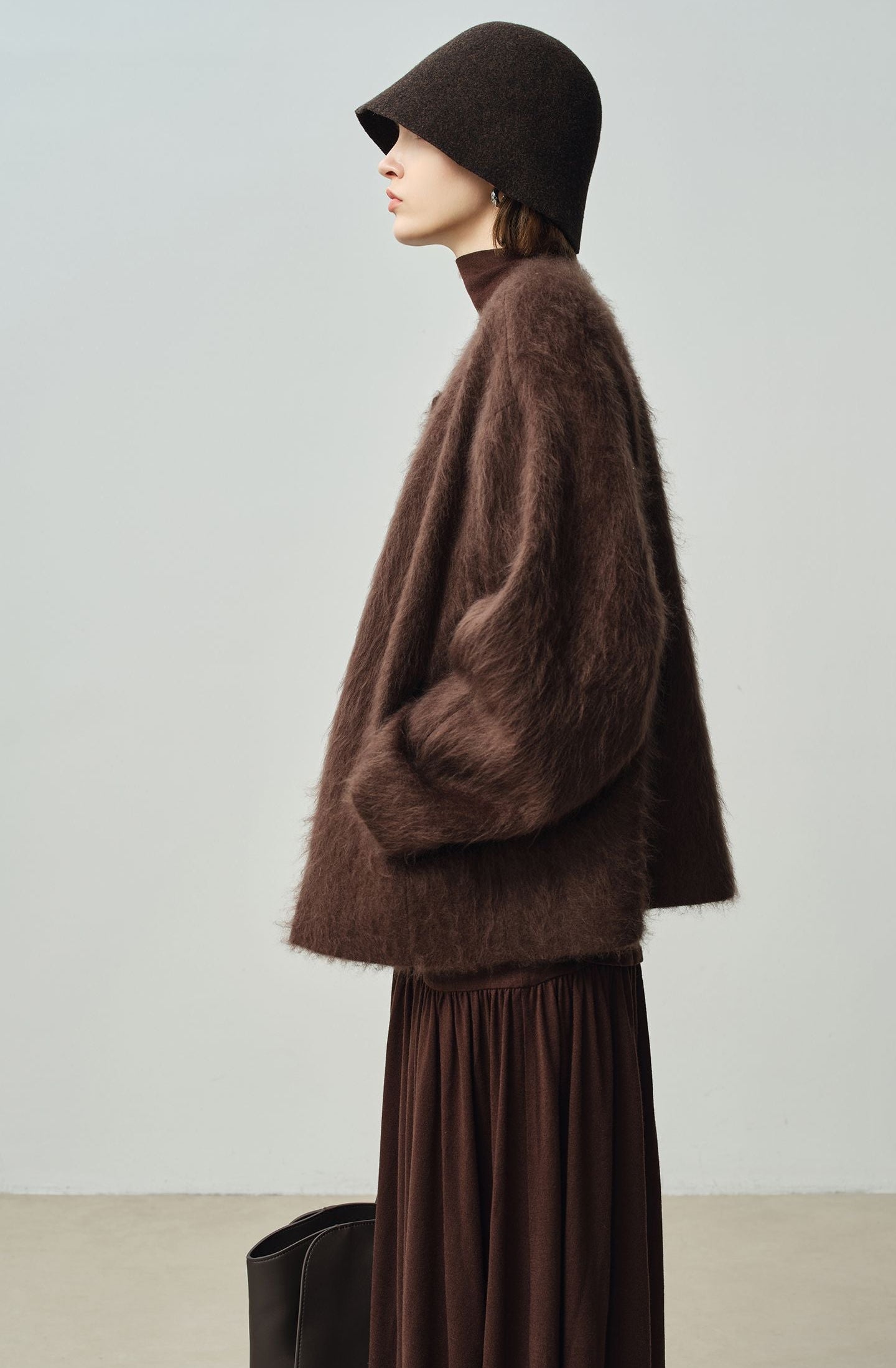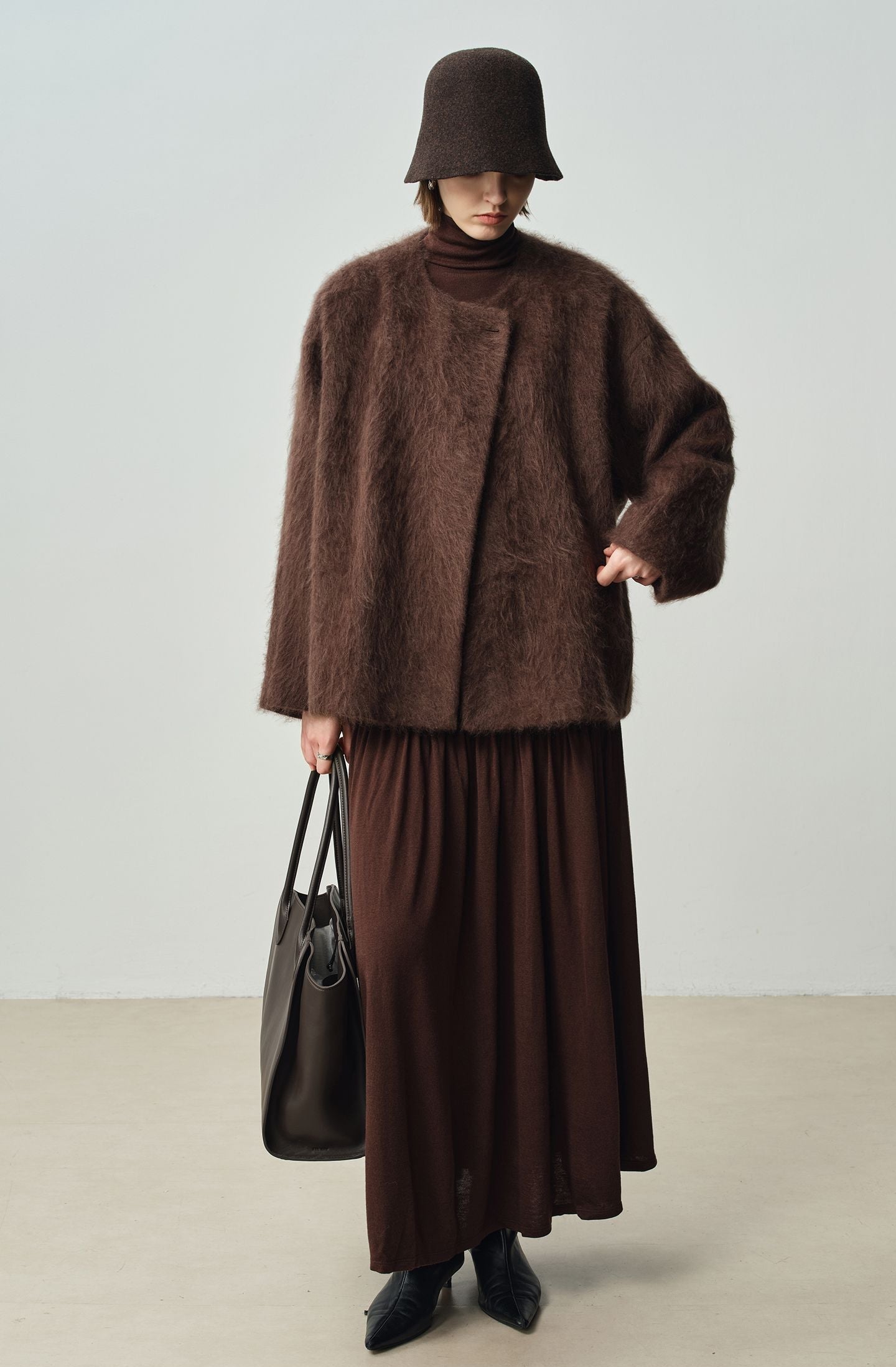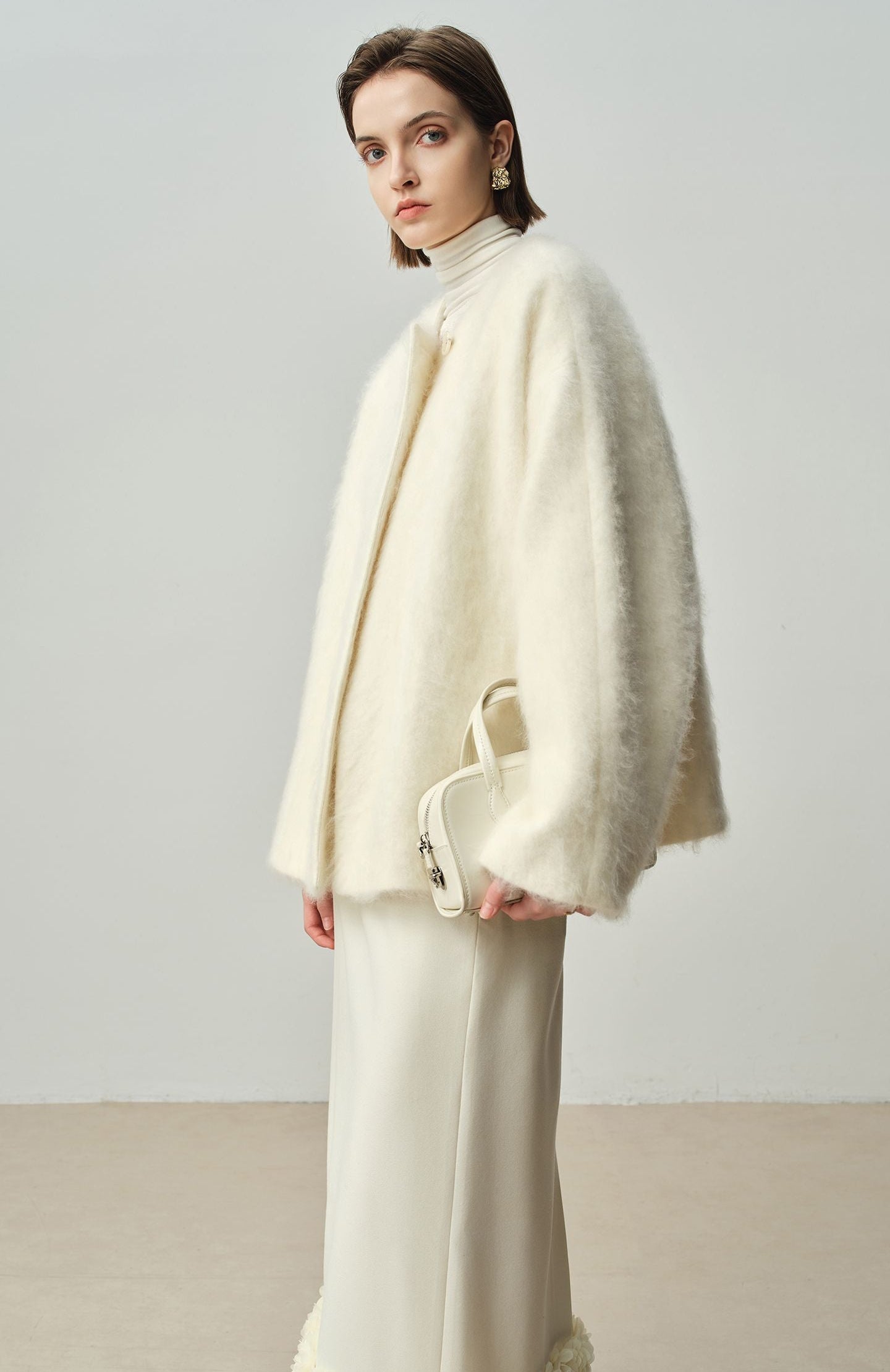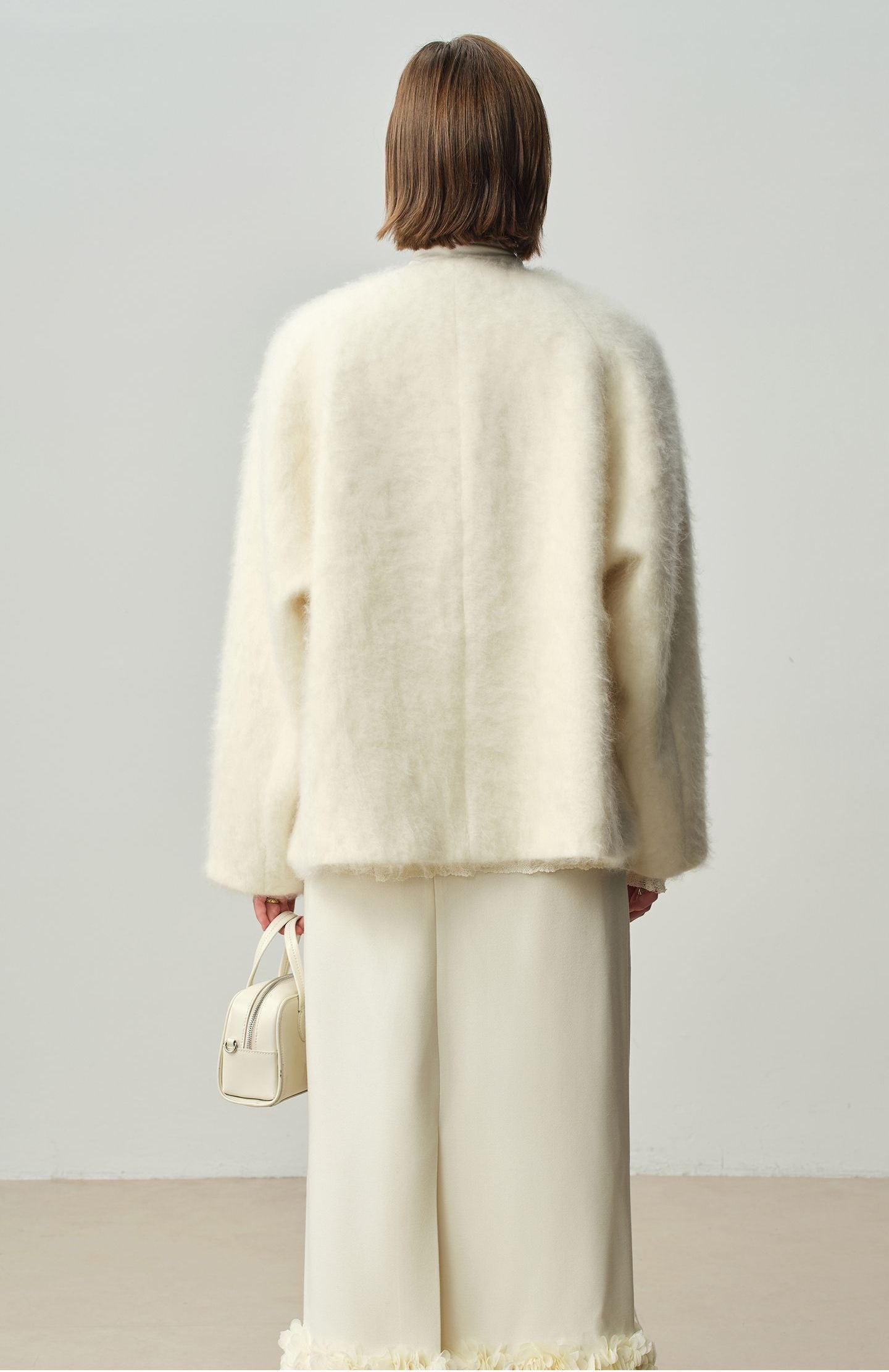 Yuvarlak yaka detayı, uzun tüy dokusu ve tek düğmeli tasarımıyla sade ama etkileyici bir görünüm kazandırır.