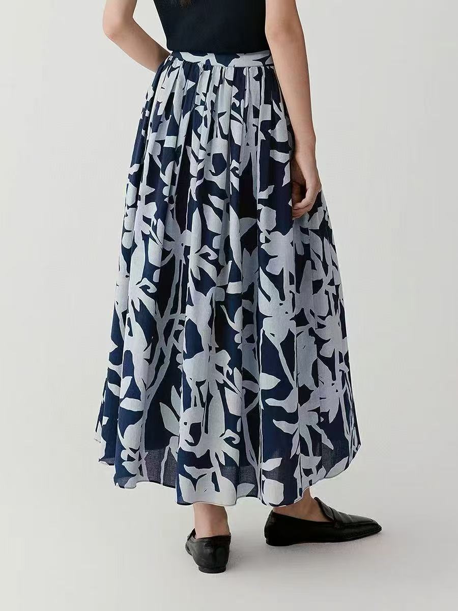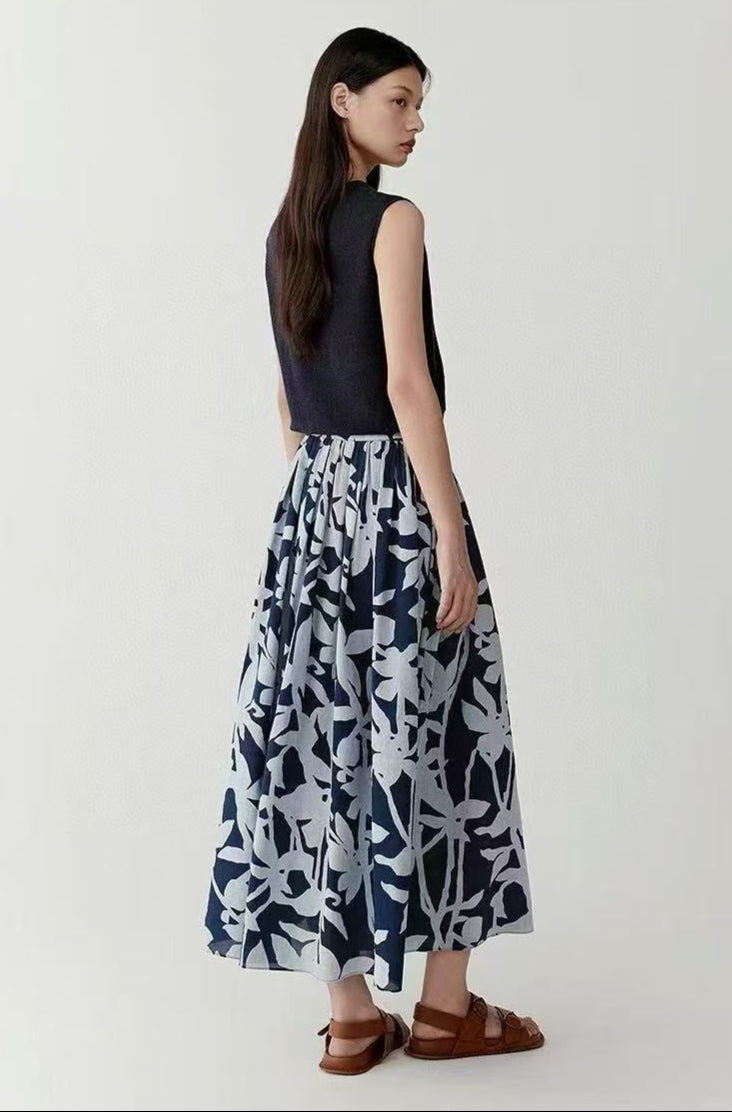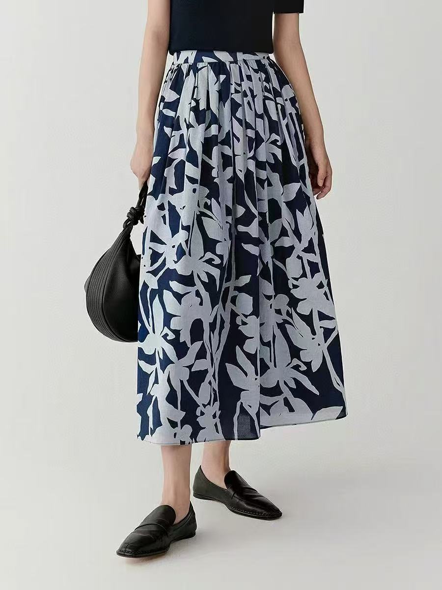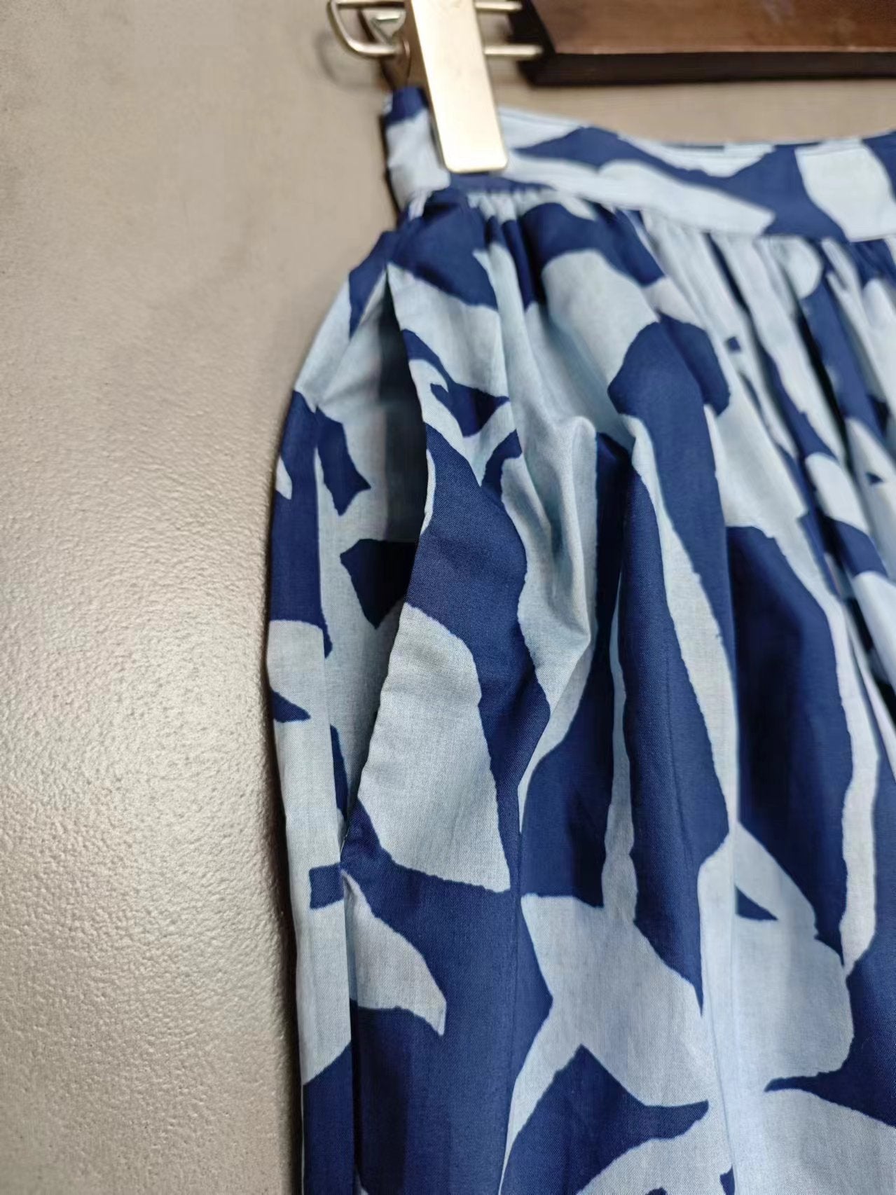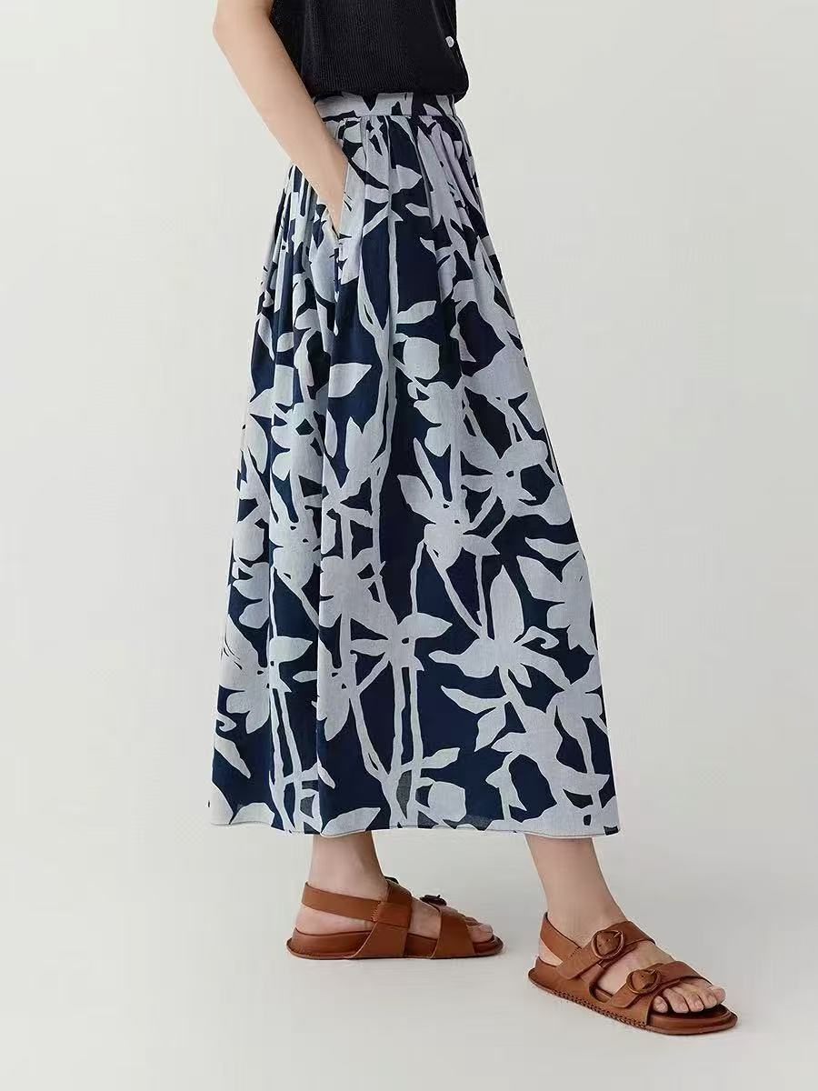 Mavi Soyut Desenli Pamuk Midi Etek – Cepli Rahat Kesim
