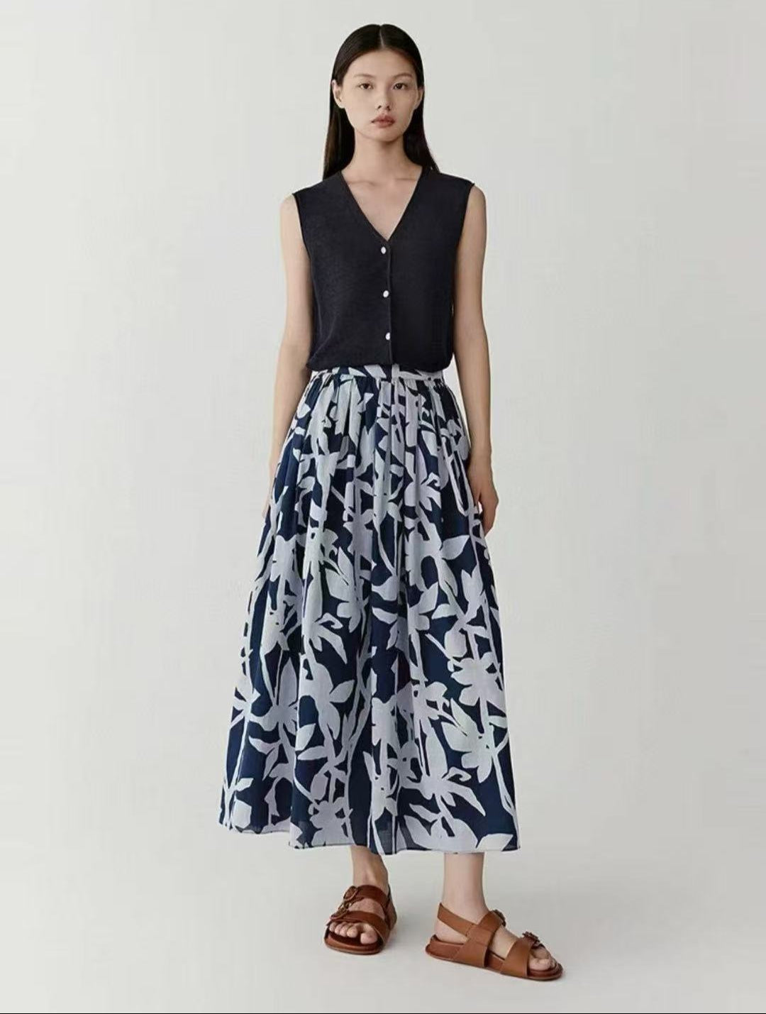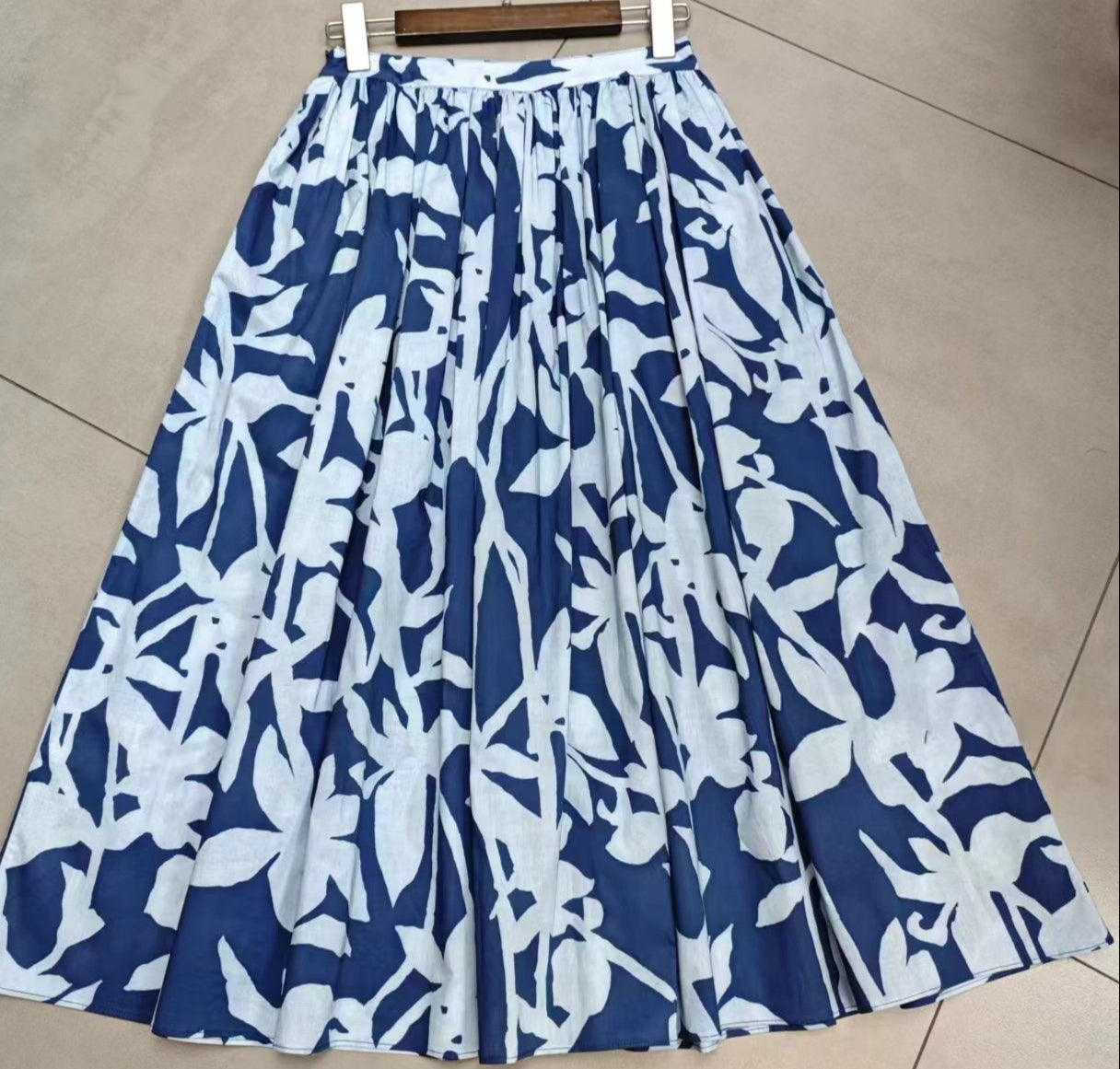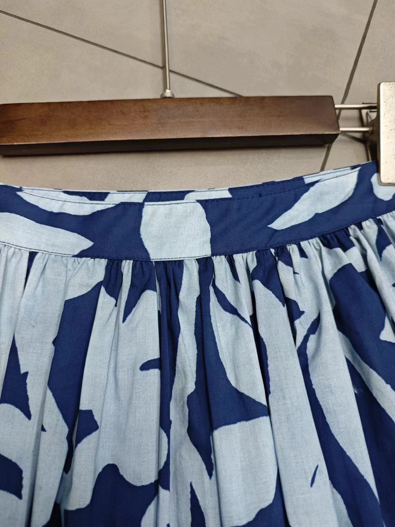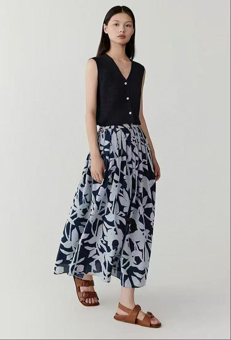 Mavi Soyut Desenli Pamuk Midi Etek – Cepli Rahat Kesim