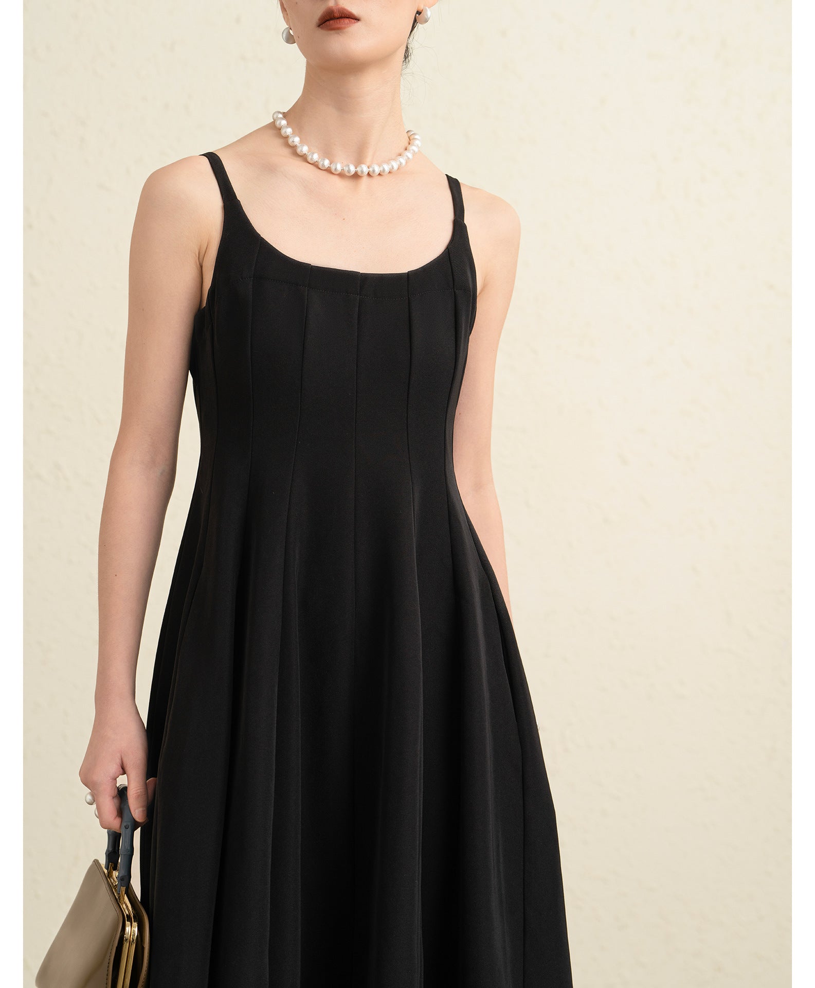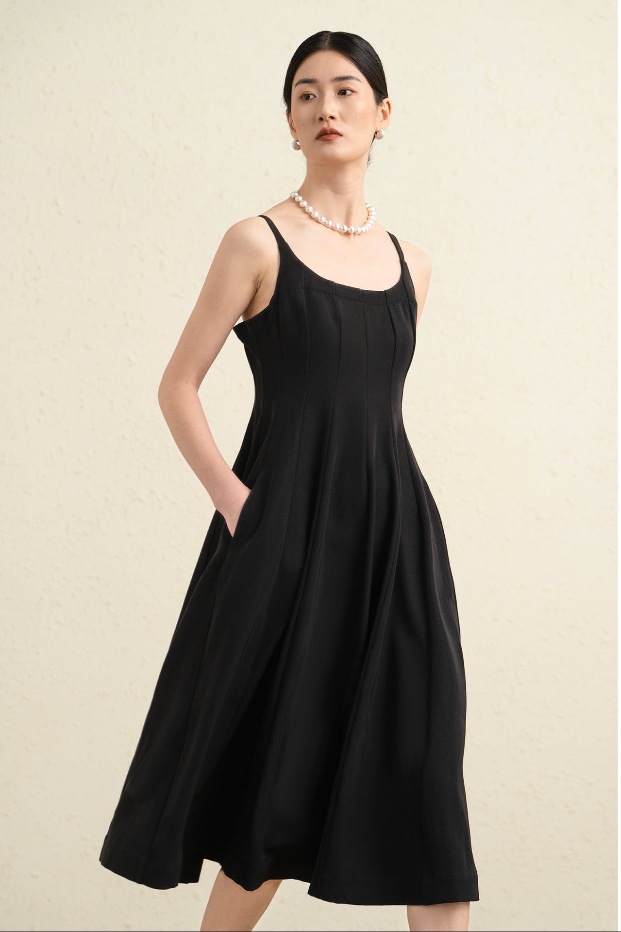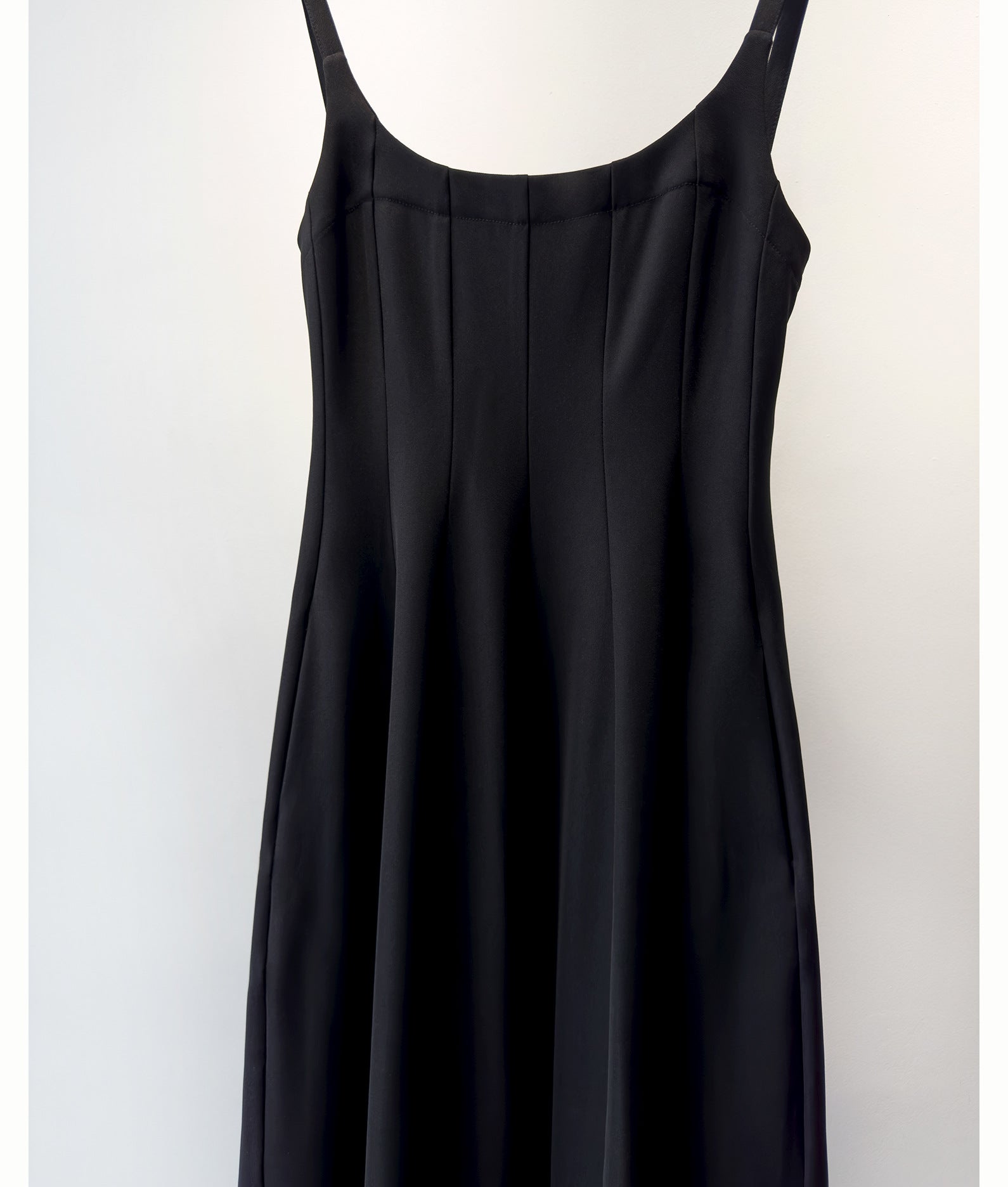 Kare yaka tasarımı boyun ve omuz hattını zarif şekilde vurgularken ince ayarlanabilir askılar elbiseye hem konfor hem de şık bir görünüm kazandırır. Yüksek bel kesimi vücut hatlarını dengeli şekilde öne çıkarırken A kesim midi etek akıcı ve feminen bir silüet oluşturur.