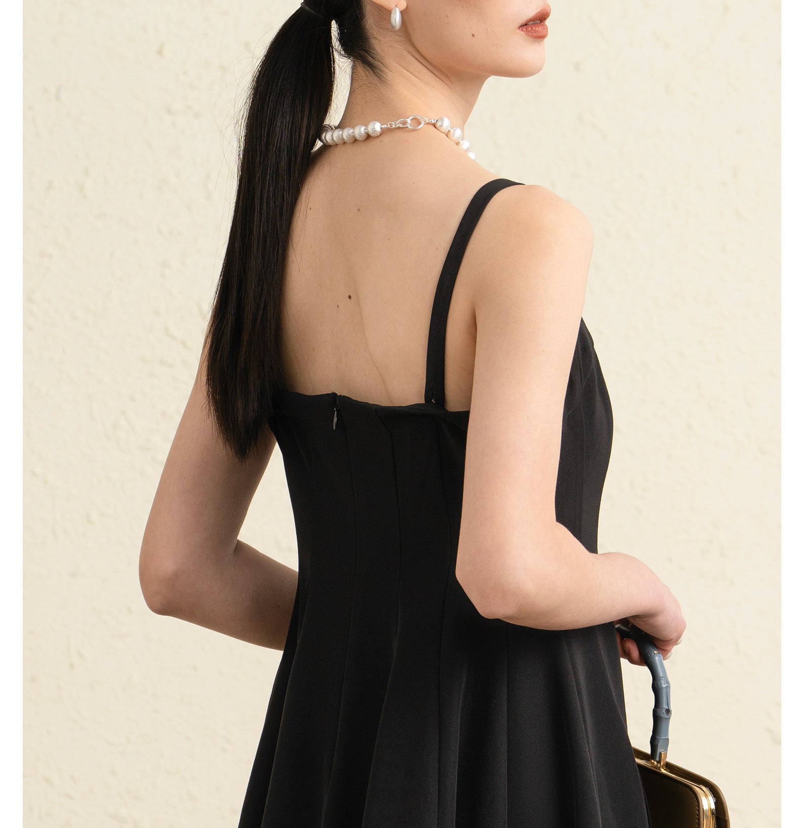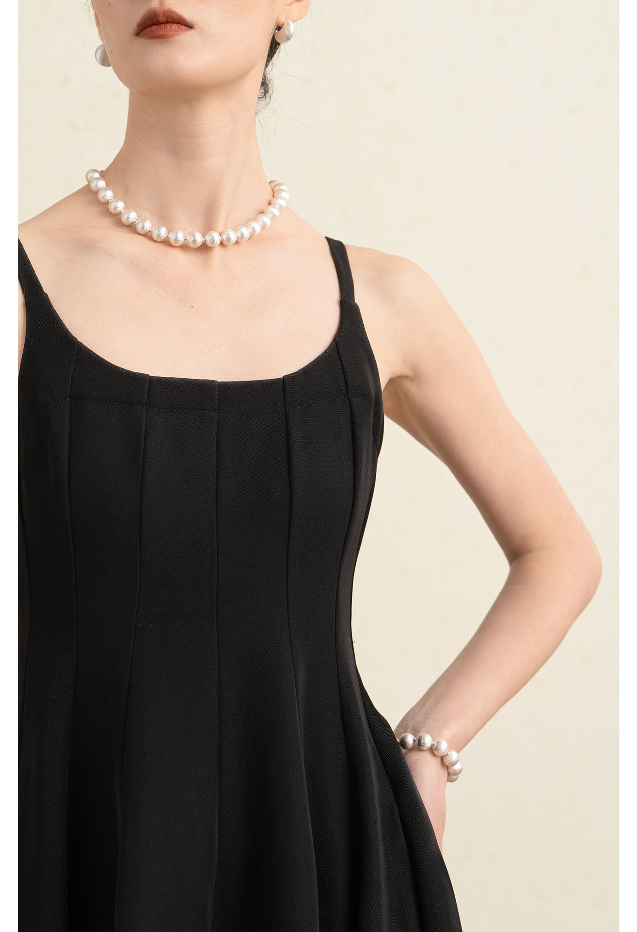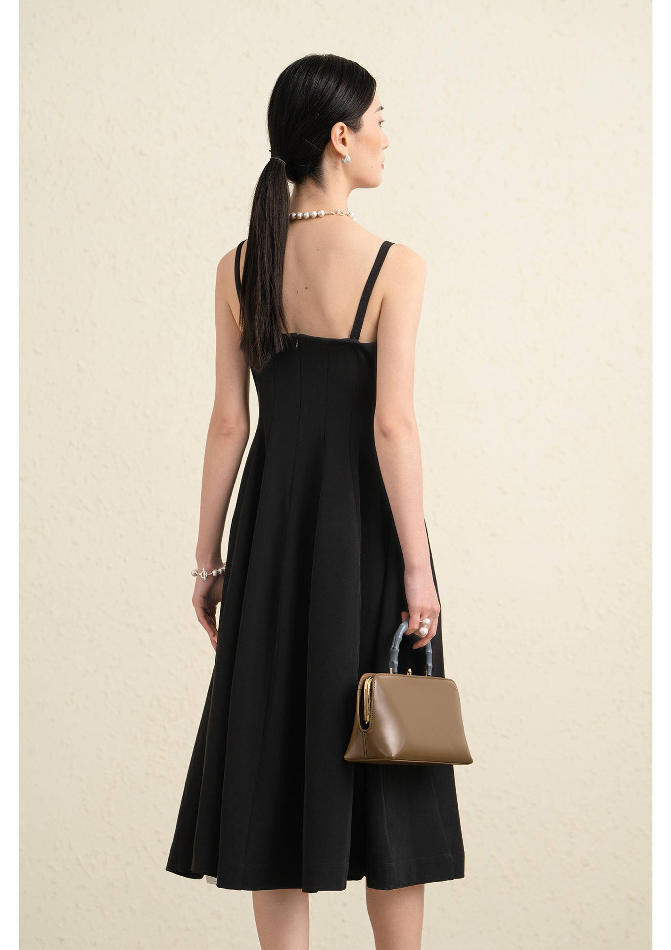 Kare yaka tasarımı boyun ve omuz hattını zarif şekilde vurgularken ince ayarlanabilir askılar elbiseye hem konfor hem de şık bir görünüm kazandırır. Yüksek bel kesimi vücut hatlarını dengeli şekilde öne çıkarırken A kesim midi etek akıcı ve feminen bir silüet oluşturur.