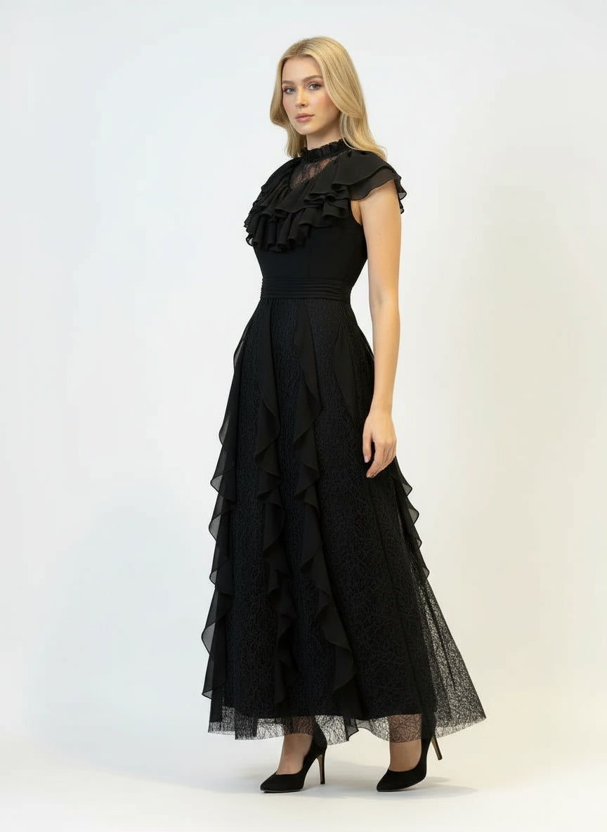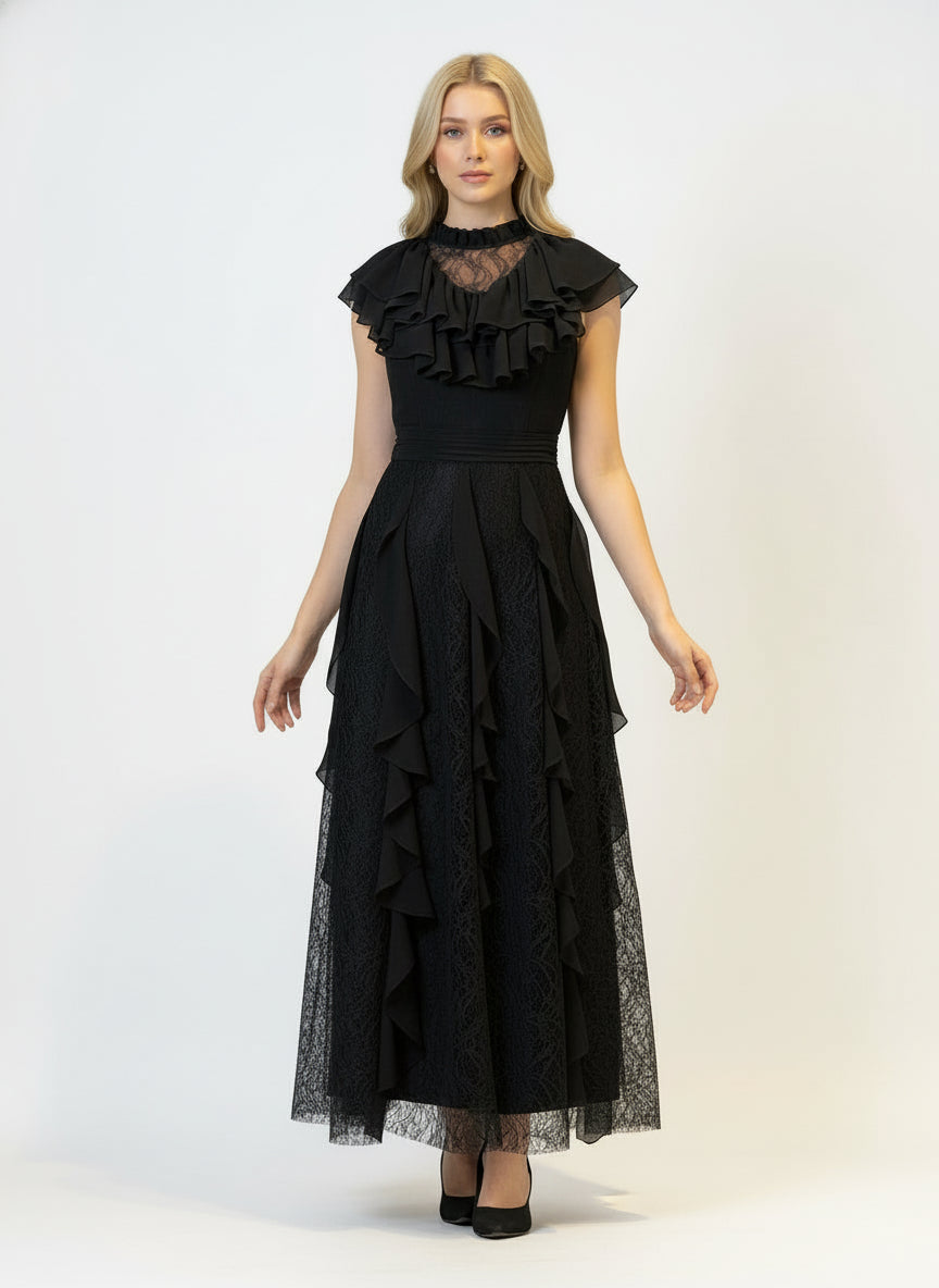 22% İndirimTül Detaylı Volanlı Uzun Elbise
