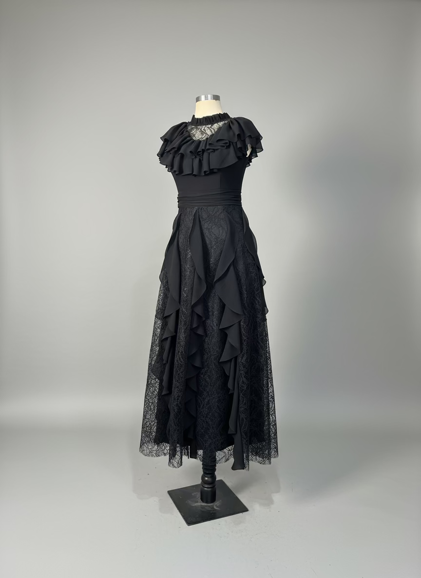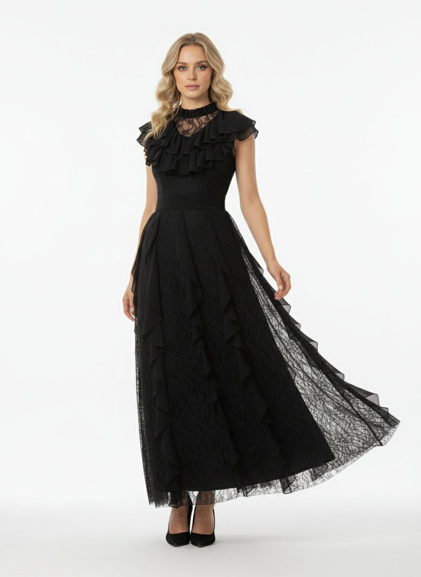 Prenses Tarzı Fırfırlı Stand Yaka Dantel Elbise