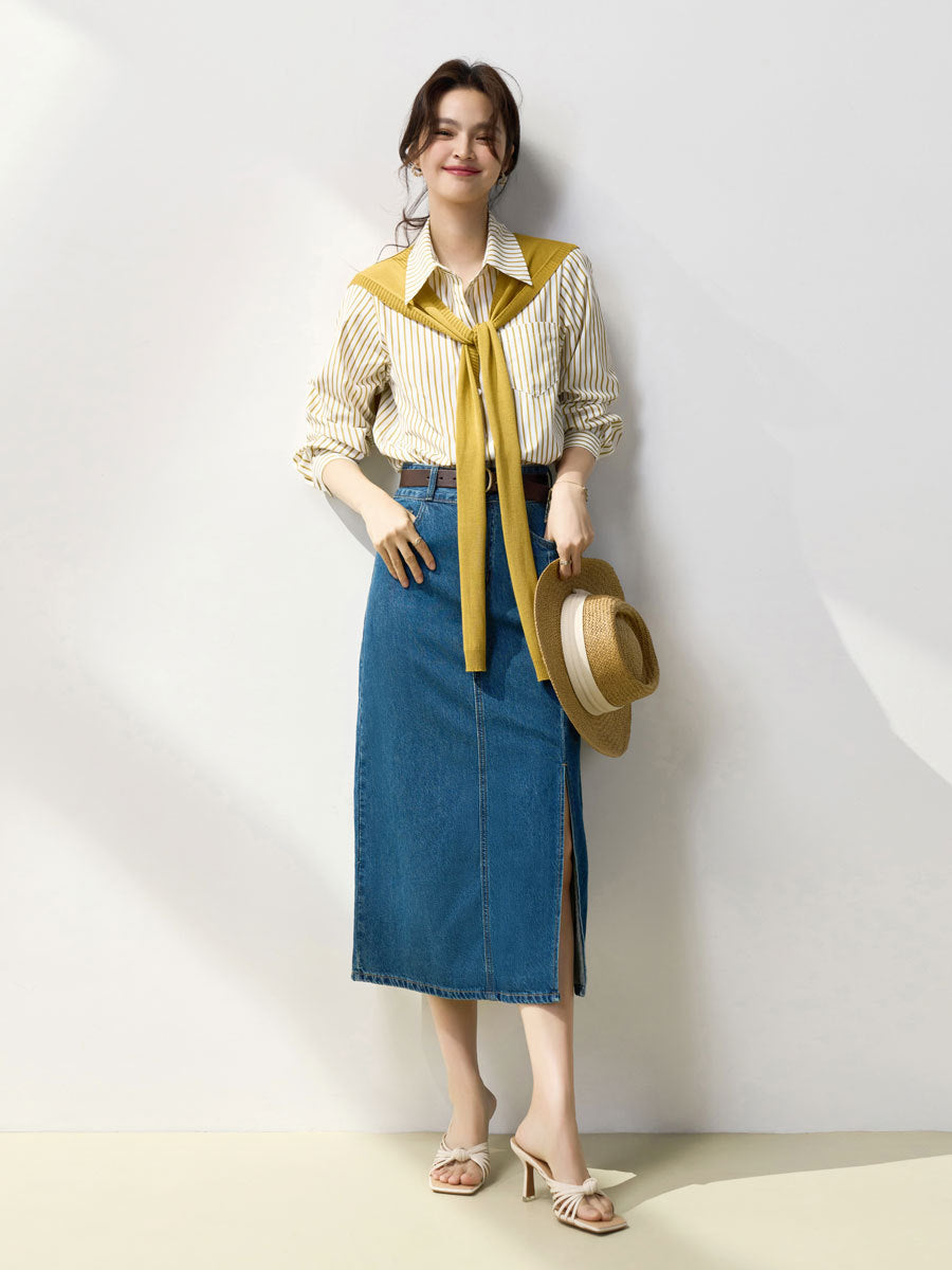 Zarif çizgileri ve sofistike detaylarıyla öne çıkan bu şal detaylı iki parça gömlek seti, sonbahar sezonunun vazgeçilmez parçalarından biridir.
