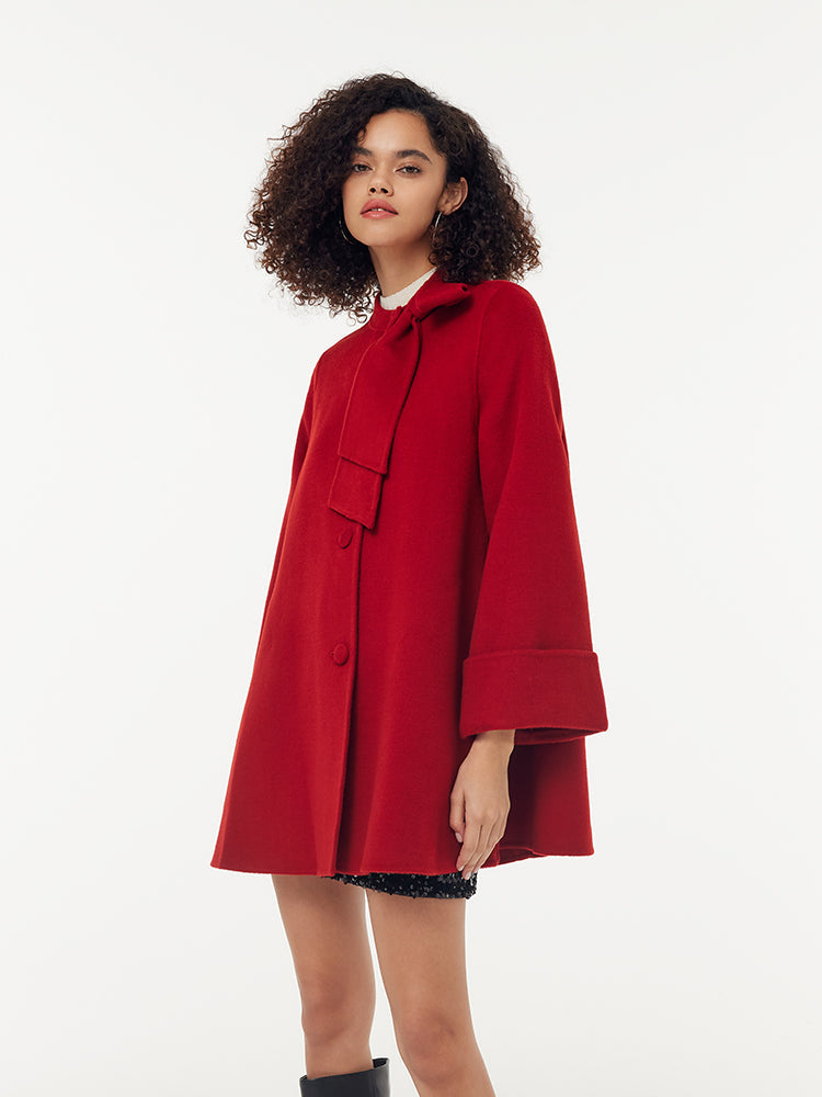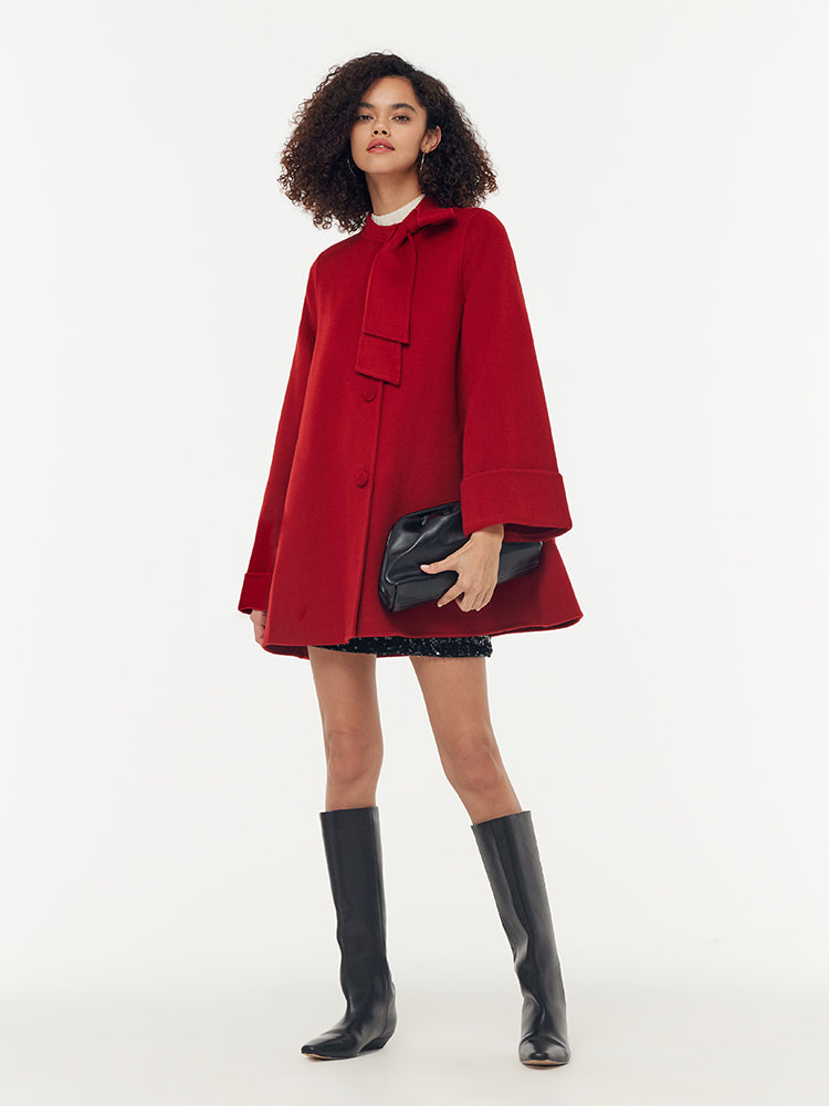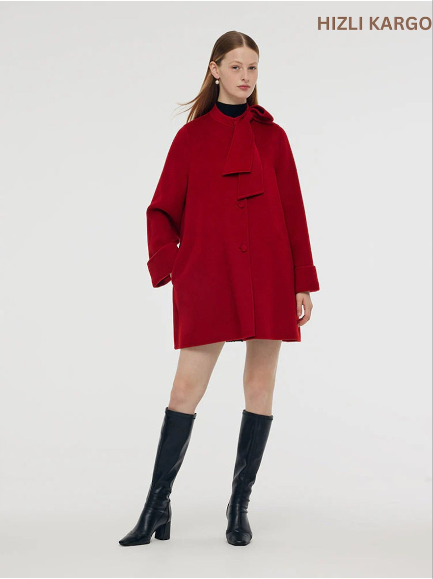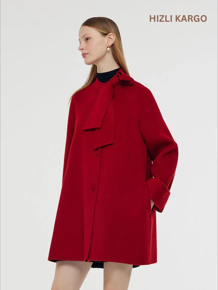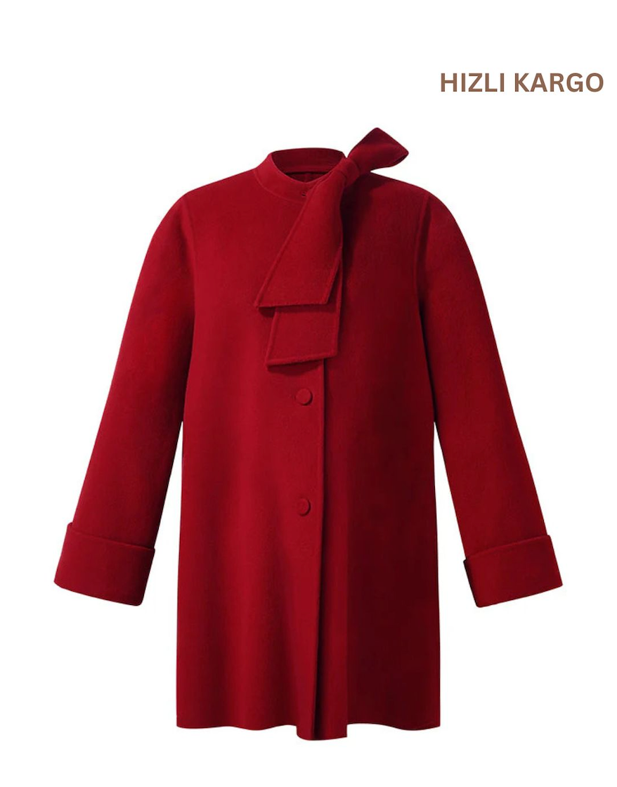 Minimalist şıklığı zarif detaylarla buluşturan bu kırmızı kaban, çıkarılabilir fiyonk detayıyla farklı stiller yaratma imkânı sunar. Kaşmir karışımlı yumuşak dokusu sayesinde hem hafif hem de sıcak tutar. Astarsız ve çift taraflı yapısı, ince işçilik ve modern görünümün birleşimini yansıtır. Gündelik şehir şıklığından özel davetlere kadar pek çok kombinle uyum sağlar. Klasik kırmızı tonu, stilinizi ön plana çıkarırken zamansız bir şıklık sunar.