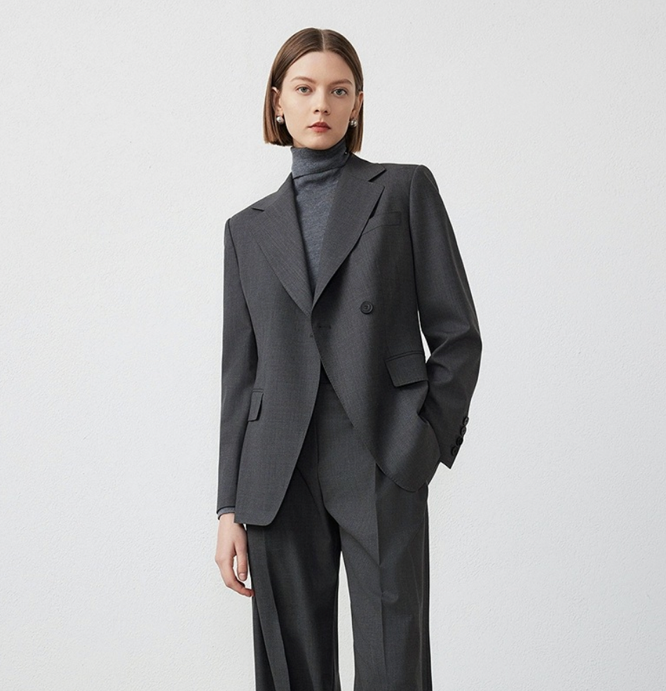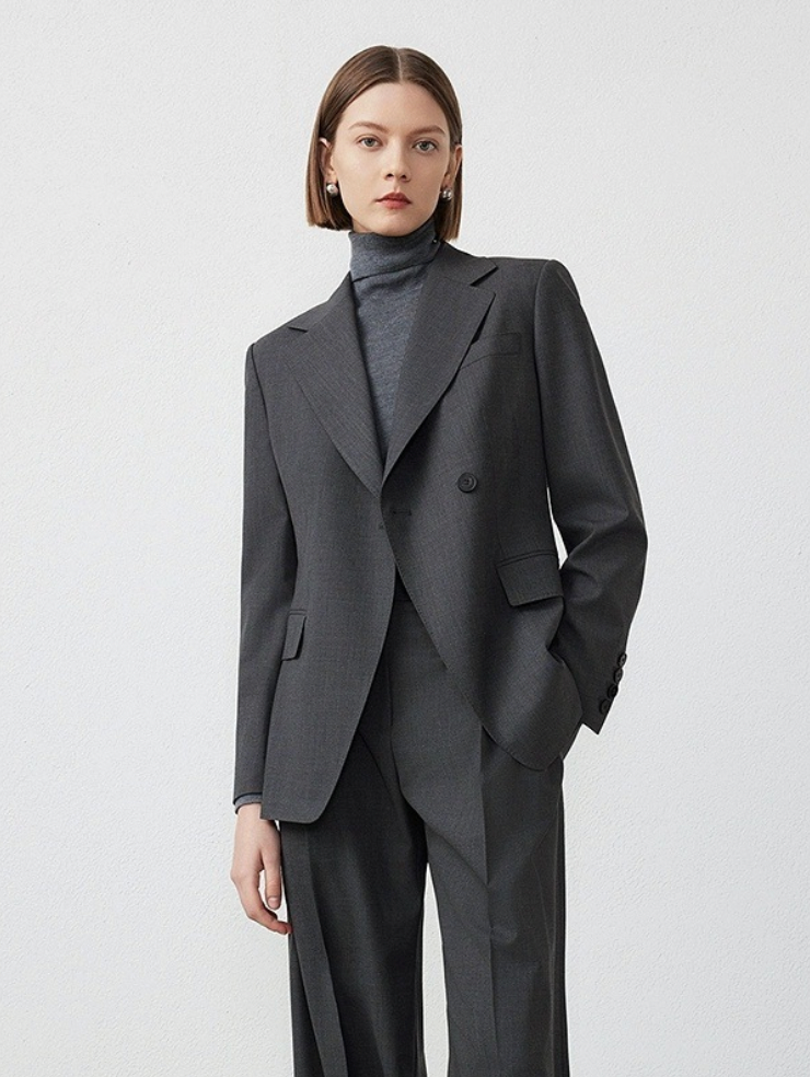 Modern şehir kadınının zarafetini yansıtan bu yün karışımlı klasik takım, profesyonel görünüme sofistike bir dokunuş kazandırıyor.