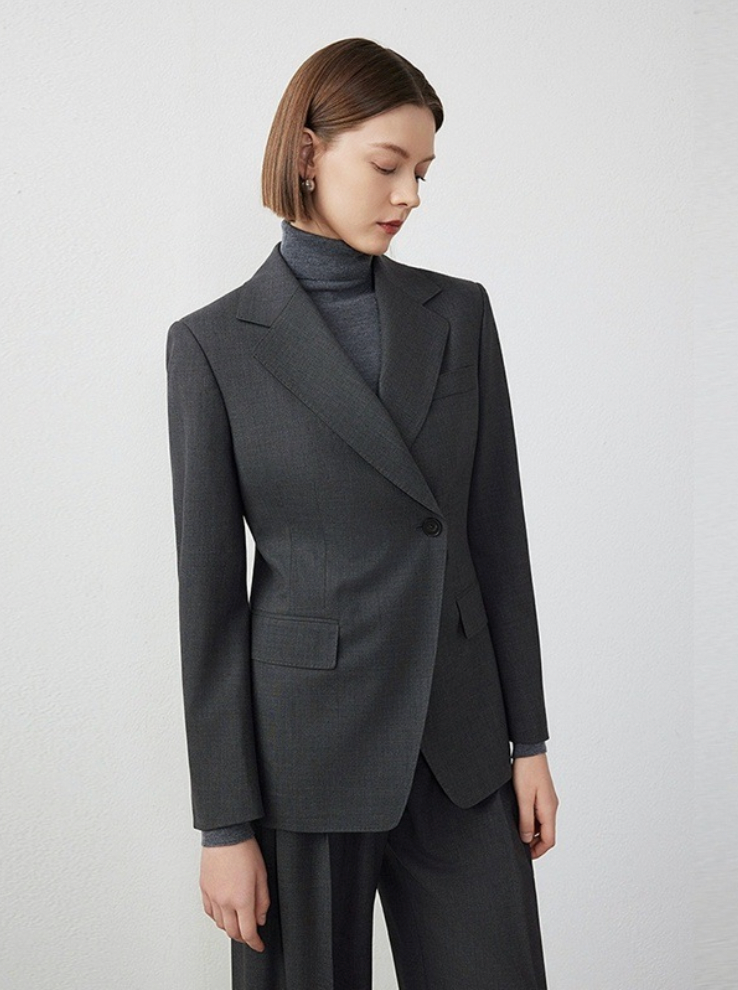 Ceket, ince bel kesimiyle vücut formunu zarifçe vurgularken; üç düğmeli klasik tasarımı ve V yaka detayı ile modern bir görünüm sunar.